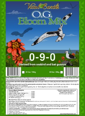 For simply amazing blooms, whether tulips or tomatoes, nothing beatsĀ VITAL EARTH'SĀ® O.G. Bloom Mix. If you're looking for the biggest, healthiest blooming in your garden, this fertilizer is a must have. A superior blend of bat & seabird guanos, specially formulated with no fillers for maximum results. An all-natural fertilizer that promotes intensive growth & flowering, as well as improve crop yields Soil deficient in organic matter may be made more productive by the use ofĀ Vital Earth'sĀ® O.G. Bloom Mix.